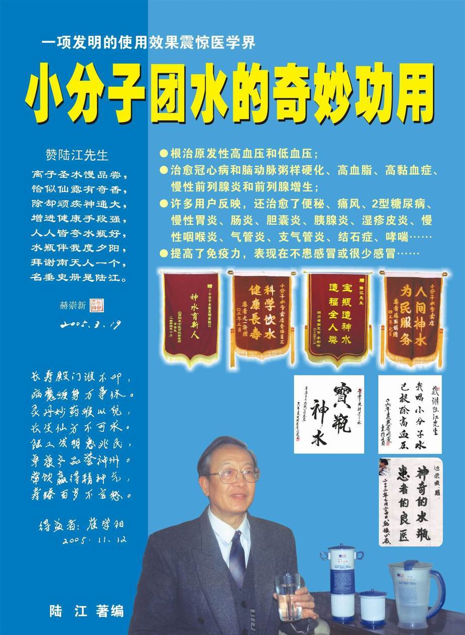 人類幾千年來患以上病癥需終生服藥,幾十年也不能治愈。可是我國南寧的高級工程師陸 江,于1990年想根治高血壓,研究發明了離子水瓶,處理出微小分子團水供飲用,經過醫院臨床試用和專家鑒定,1999年獲中國發明專利權,產品于2000年投放市場后一直跟蹤調查,據全國各地用戶反饋:祛除了高低血壓、糖尿病和冠心病,并使前列腺增生、咽喉炎、鼻竇炎、慢性氣管炎、支氣管炎、矽肺病、哮喘、慢性胃炎、腸炎、慢性膽囊炎、慢性腎炎、腎衰、膀胱炎、便秘、痔瘡、風濕性關節炎和濕疹皮炎及中風后遺癥等病癥不藥而愈。為什么喝微小水能治20多種?。筷?nbsp;江從1991年德國科學家發現細胞膜水通道僅為2納米獲得啟發,認為多種器官患病是因細胞脫水,不能正常代謝和分裂增殖,才使器官細胞減少致衰弱萎縮而形成細胞缺水性病癥。22年來的實踐有力地支持了“細胞脫水致病”這一重要論點,表明喝微小水可滿足細胞的生理需求,補水就能祛病,是生命科學新亮點。